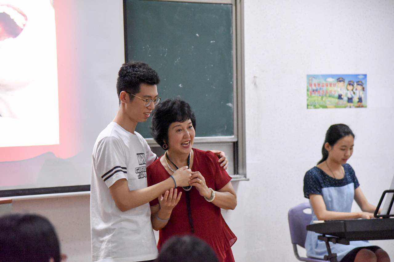 最令人印象深刻的应该是张老师教大家唱《夫妻双双把家还》的情景。为了让同学们更好地唱出夫妻恩爱的感觉,张老师请来自14级本科汉语国际教育专业的章近勇同学扮演歌曲中的相公,老师自己则扮演娘子。两人在演唱时的”恩爱“互动,让台下观众捧腹大笑,也将全场的演唱热情推向高潮。
